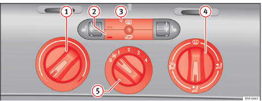 – Mit den Reglern Abb. 106 1 und 4 und mit dem Schalter 5 stellen Sie die Temperatur, die Luftverteilung und die Gebläsestufe ein.