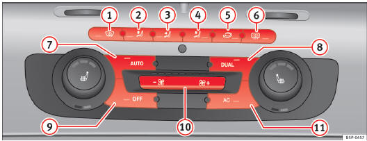 – Mit den Reglern Abb. 107 1 und 5 und mit dem Schalter 6 stellen Sie die Temperatur, die Luftverteilung und die Gebläsestufe ein.